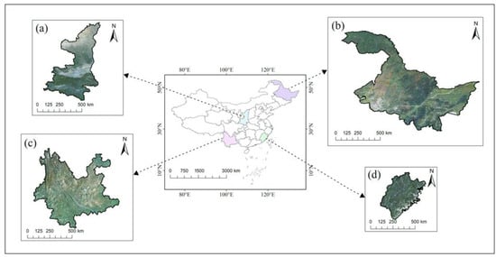 Spatial patterns of the study area. (a) Shaanxi province; (b) Heilongjiang province; (c) Yunnan province; and (d) Fujian province. Remote sensing images of the four provinces came from the Landsat 8 OLI data.
