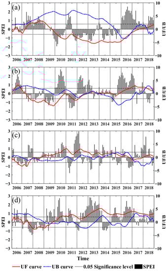 Inter-annual variation and Mann–Kendall test curves of SPEI in four provinces from 2006 to 2018. UF was obtained from the forward sequence data of SPEI. UB was obtained from the inverse sequence data of SPEI. (a) Yunnan province; (b) Fujian province; (c) Shaanxi province; and (d) Heilongjiang province.