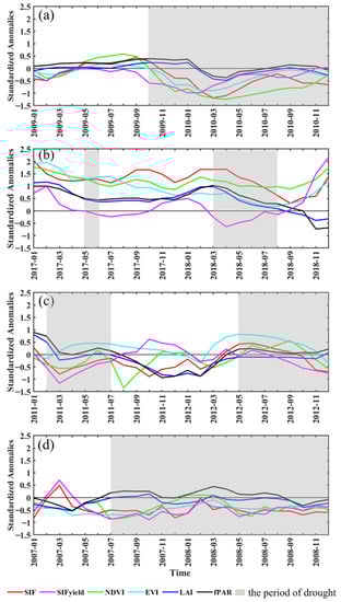Under drought stress, SIF, SIFyield, VIs, LAI, and fPAR values showed a decreasing trend. The time and extent of the occurrences of drought indicated by each variable were determined by quantifying its abnormally low value. To avoid the influence of seasonal cycles on the data results, multi-year monthly averages were calculated for each grid in the region. The anomalous values for all remote sensing variables were the values that deviated from the monthly averages from 2006 to 2018. To compare SIF, SIFyield, VIs, LAI, and fPAR, standardized anomalous values were also calculated with: