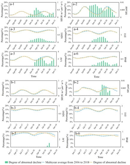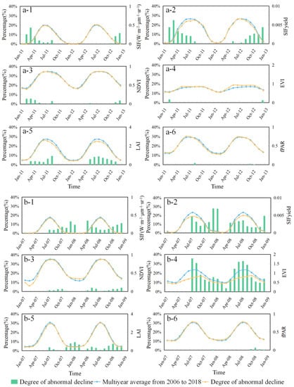 (a1–a6) The seasonal cycle variation curves of present values and multi-year averages and the abnormal decrease amplitude of the present values from the average values of SIF, SIFyield, NDVI, EVI, LAI, and fPAR, respectively, of the subtropical evergreen broad-leaved forest region in Shaanxi province (b1–b6). The seasonal cycle variation curves of present values and multi-year averages and the abnormal decrease amplitude of the present values from the average values of SIF, SIFyield, NDVI, EVI, LAI, and fPAR, respectively, of the warm-temperate deciduous broad-leaved forest region in Shaanxi province.