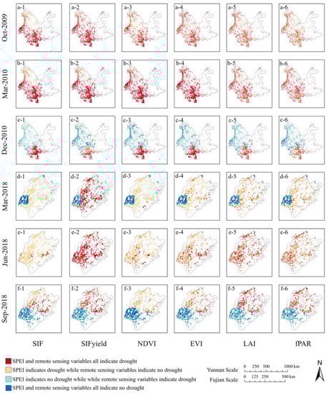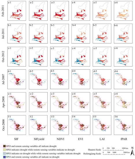 For Shaanxi, the spatial extent of drought indicated by SIFyield also showed a larger coincident with that of the SPEI at the beginning of the drought. NDVI and SIFyield described a similar drought extent in the middle drought, but there were some differences in the spatial distribution. SIFyield showed drought relief in western and southern Shaanxi in the later period, while the other variables showed large drought legacy effects. For Fujian, only SIFyield showed coincident drought regions with the SPEI during the drought period. In contrast to the first two provinces, LAI and fPAR performed better than VIs in drought monitoring. For Heilongjiang, SIFyield showed the largest coincident drought regions during the drought period. Consequently, VIs, LAI, and fPAR behaved differently in different provinces, which may be related to the vegetation type and vegetation cover. Overall, SIFyield captured a greater spatial extent of drought for all four provinces, especially for the early detection of drought stress.