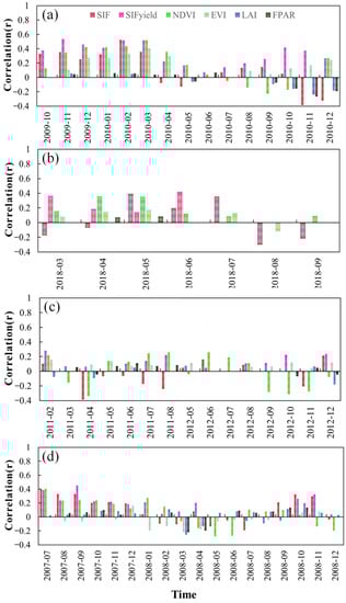 Correlation between standardized anomalies of SIF, SIFyield, NDVI, EVI, LAI, and fPAR with SPEI. (a) Yunnan province; (b) Fujian province; (c) Shaanxi province; and (d) Heilongjiang province.