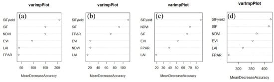 Variable importance (x axis value) of remote sensing variables for explaining the performances of each variable in detecting drought event. (a) Yunnan province; (b) Fujian province; (c) Shaanxi province; and (d) Heilongjiang province.