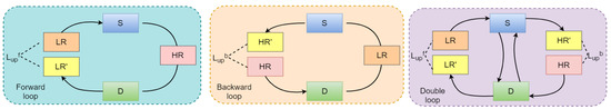 The cycle structure of our closed-loop framework. Our framework consists of two generative networks for super-resolution (S) and down-sampling (D), respectively. The left subfigure starting with the LR image is denoted as a forward loop, the center one starting with the HR image is denoted as a backward loop, and the right one is a double loop. and are loss functions denoted in Equations (1) and (2) separately.