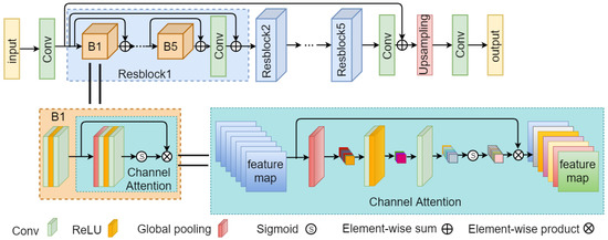 The structure of super-resolution network S is similar to RCAN (Residual Channel Attention Networks) [46], and its function is opposite to D. We adjust the number of modules in the network according to our SR task. The overview of super-resolution network S is shown in Figure 3. Specially, we use five residual modules as the main body, and each residual module contains five stacked blocks with a convolution layer at the end. Each block contains two convolution layers, a ReLU layer and channel attention (CA) module [47]. Multiple levels of skip connections are all over the network. Sub-pixel layer [48] is selected to up-sample feature maps to a larger size. Finally, the output image is obtained through a convolution layer. It should be noticed that the CA module used in this paper is to further tap the learning ability of convolutional neural networks. Its overall structure is shown in the lower right corner of Figure 3. The global pooling layer simplifies each channel of the previously extracted feature map to a single value, i.e., the average value of each channel. Then the number of channels is first reduced by a convolution layer and then restored to the original number by another convolution layer. The sigmoid activation function maps the value of each channel to the range of as the weight of each channel feature map. The original feature map multiplies its weight to get the final feature map with channel attention. Through such a simple process, the channel attention module further enhances the nonlinear mapping ability of the convolutional neural network.