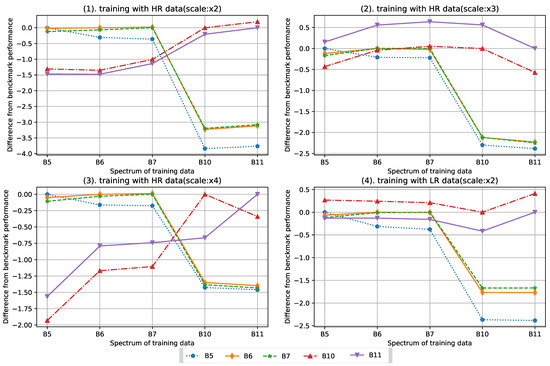 PSNR performance difference between each band and their benchmark result. The benchmark of each band refers to the result obtained by the model trained with the same band.