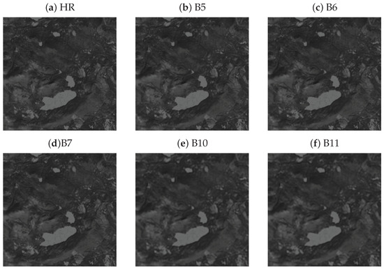 We can see that although they are all infrared remote sensing data with the same resolution, the difference in the spectrum of the training data will also have a great impact on the performance, which is more obvious in the PSNR index. In most cases, the SR model achieves the best results when testing images have the same spectrum as the training data. Sometimes, an SR model trained by a similar spectrum performs better than the model trained by its corresponding spectrum, and the gap between them is usually small. Such gap can be clearly shown in Figure 6, where we use the results obtained by the model trained by the same spectrum as the performance benchmark for each band and show the difference of each model with its benchmark. It can be seen that for bands B5, B6, and B7, the models trained by B5, B6, and B7 usually perform well. The models trained by B10 and B11 always achieve better SRs of B10 and B11. B5 maintains the rule that the benchmark result is the best, and the training data cannot be replaced by other spectra. Figure 7 shows a partial image of B5 testing set. It can be seen that the model trained by B10 and B11 has a poor recovery effect on the small lines. Compared with other bands, B10 and B11 have less volatility and better band adaptability. However, when the scale factor is 4, the band adaptability is extremely reduced, and the best performance can be obtained only when the data matches.