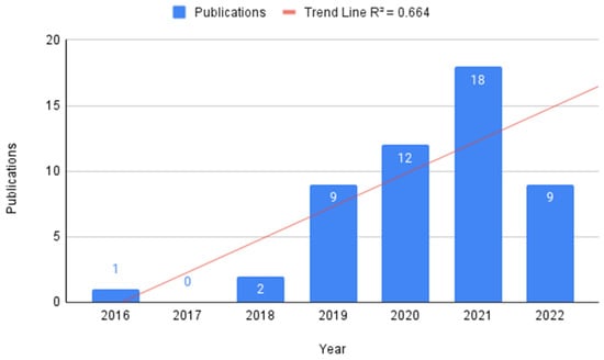 Of the 10,403 articles found in the scientific literature Scopus database, during the applications of the filters shown in Figure 1, only 51 articles remained to be analyzed in more detail. These reviewed articles were published between 2016 and 2022 (Figure 3), The oldest one was published in September 2016, and the most recent was in June 2022, the month in which the data were collected. Therefore, the influence factor of each factor was calculated on the same date considering their citations and year of publication.