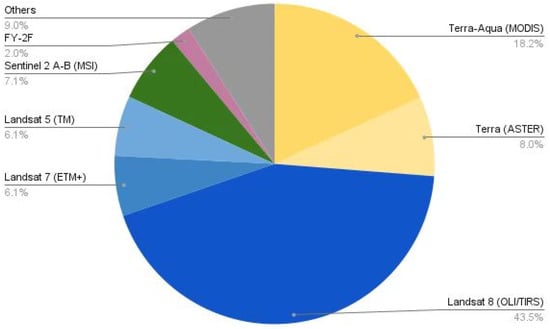 The satellites and sensors highlighted as “others” are those that had only one occurrence in the reviewed articles, such as Worldview 3 used in [23], Meteosat Seviri in [24], Sentinel 1 A-B Multispectral Instrument (MSI) used by [25], PROBA-V: Copernicus Global Land Cover Layers (CGLS-LC) 100 in [26], ECOSTRESS used in [27], Copernicus Global Cover maps (C-GLOPS) also in [27], NECP-GR data by [28], Gaofen-1 in [29], and Visible Infrared Imaging Radiometer Suite (VIIRS) by [30].