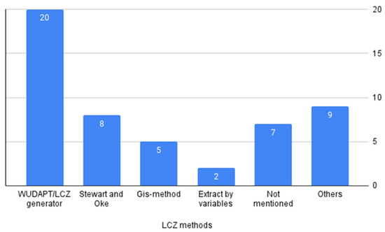 Some methods are used in the literature to obtain the local climate zones (LCZs). The most used among the articles reviewed is shown in Figure 10.