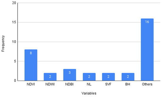 Other spectral indices mostly used were the Normalized Difference Water Index (NDWI) and Normalized Difference Building Index (NDBI), which appeared in 14% of the studies. For example, [50] also used them with the NDVI as conditional arguments for pixel size reclassification and LST variables for the prediction model.