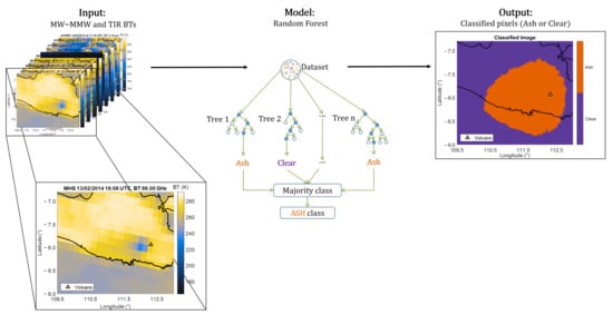 In the last decade, the use of machine learning algorithms became popular also in atmospheric science. Most of the works present in the literature use the collected radiances only in the infrared to make the detection [,,]. In addition, most of these models are designed to work with one specific sensor, even if some new studies are developing sensor-independent schemes []. The presented model instead combines different spectral information (i.e., MW-MMW and TIR) to attempt a general rule applicable on different sensors onboard of different platforms. The goal is to find a model that can detect the volcanic cloud automatically (i.e., without user action) and independently from the used sensor. The learned model is obtained by the following procedure: (1) definition of training images; (2) identification of the most relevant features, i.e., those that can better reflect the variability of the dependent variable; (3) model training; (4) model performance and selection; (5) classification of unseen images. The training data sample uses data collected by the MW-MMW and TIR sensors for the 2014 Kelud and 2015 Calbuco eruptions. Table 1 summarises the data and their application in the RF classification.