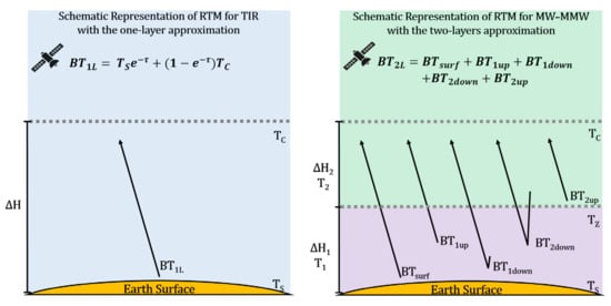 The radiative transfer model (RTM) scheme is designed to simulate the BTs observed by the TIR and MW-MMW sensors (Figure 2). The contributions coming to the sensor are the background radiance (land or water), the atmosphere radiance and the space radiance (which is neglected during cloud physical properties retrieval []). We solve the radiative transfer differential equation by considering one- and two-layer approximations, with a normal pointing to the surface (i.e., we do not consider the inclination angle). We ignore the multiple scattering effect and the additional extension due to the electrostatic charge within highly explosive activity []. The one-layer model () is applied to the TIR observations, as proposed in [], whereas the two-layer model () is applied to the MW-MMW observations. The (Figure 2 left panel) is the solution to the radiative transfer differential equation considering the one-layer approximation, where, and are, respectively, the surface and the top cloud temperature and is the transmittance, expressed as a function of the optical depth τ, which is computed applying the following approximated formula:
