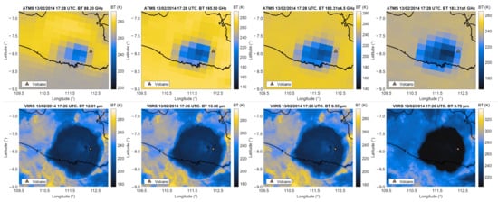 Volcanic eruptions are one of the most impressive and dangerous natural phenomena on our planet that, over the years, have influenced human life. During highly explosive eruptions, a great number of volcanic particles, also named tephra, are ejected into the atmosphere, and can remain suspended for several weeks. The surrounding areas of volcanoes are highly exposed to major hazards due to the fall out of blocks/bombs (size > 32 mm) and lapilli (size > 2 mm) [,]. Smaller particles (coarse ash < 2 mm and fine ash < 63 μm), instead, can travel for long distances in a few hours and remain suspended in the atmosphere for days. These smaller particles are largely responsible for damaging aircrafts and creating aviation traffic impairments []. For this reason, timely predictions of time–space dispersion of volcanic particles can ensure an improvement in defining the golden standard for airline flights and prevent damages []. Orbiting satellite observations can provide a large amount of daily data. The global perspective offered by Geosynchronous Earth Orbit (GEO) and the Low Earth Orbit (LEO) satellite systems is of vital importance for monitoring volcanoes [,], especially those in remote and inaccessible areas. Data from the LEO satellite microwave and millimetre-wave (MW-MMW) radiometers, such as Advanced Technology Microwave Sounder (ATMS) and Microwave Humidity Sounder (MHS), can be combined with thermal-infrared (TIR) spectroradiometers, such as Visible Infrared Imaging Radiometer Suite (VIIRS) and Advanced Very High Resolution Radiometer (AVHRR), to have more accurate estimates of the near-source volcanic cloud []. Whereas the LEO infrared data analysis represents the classic approach in the study of explosive activity by satellite, given their remarkable spatial resolution and sensitivity to ash clouds, their brightness temperature (BT) difference signatures can saturate because of large amounts of tephra mass mainly near the volcanic source. Moreover, the presence of tephra with a radius larger than 15 µm cannot be detected using these sensors, due to their detection limits [,], leading to inaccurate detections of some properties in the proximal or near-source volcanic cloud. In support of the TIR sensors, the MW-MMW sensors allow larger volcanic particles (⪆50 µm) to be observed. Actually, the near-source volcanic plume does not typically extinguish the MW-MMW signal, especially in the first hours of the eruptive event [], probing the entire eruption column []. However, one of the drawbacks of MW-MMW sensors is the poor spatial resolution (up to 32 km). In the past, the MW-MMW bands have also been exploited to study volcanic plumes and their electrification processes [,,].