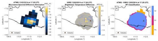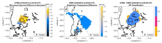 The RF model allows images to be automatically processed without the arbitrary threshold choice and has, in our opinion, promising results. Moreover, our results underline how it is possible to combine different spectral information, coming from different platforms, to have a better characterisation of the volcanic cloud. The RF model is able to balance false alarms and the FN while classifying new images (see Figure 8C and Figure 11C). Indeed, for the Kelud eruption the F1 score is 0.9049 and for the Calbuco is 0.9271. It is well known that the MW-MMW signatures between 90 and 183 GHz are more effective in identifying the near-source plume, even though they have a poorer spatial resolution, up to 32 km compared with 750 m of TIR observations. Instead, the TIR signatures perform better in identifying the edges of the proximal cloud, since, close to the crater, the signal tends to saturate due to the high optical extinction of the near-source volcanic cloud and the strong presence of water particles. The areas detected by both sensors (ATMS and VIIRS) highlight how some areas are contaminated by both bigger and finer volcanic particles. Further improvements in terms of detection should be considered, especially for the machine learning method. The RF results are promising but collecting more heterogeneous data should make the training dataset more statistically representative for this task. We know that using only a few images can affect the performance of the model. However, it is not easy to find cases where both MW-MMW and TIR signatures are available with a small difference in the time span. The absence of GEO MW-MMW sensors makes the acquisition even harder. It is also worth mentioning that this was a first attempt to prove the possibility of combining different information without complex data manipulation (polarisation and scanning angle corrections). Furthermore, the RF model can be improved by moving from a binary to a multiclass classification problem by considering, for example, “ash on meteorological cloud”, “ash on land” and “ash on water” as already tested for infrared signatures [,]. This could increase the performance of the model, in particular when the scene is significantly contaminated by meteorological clouds, as it is in the Kelud event.