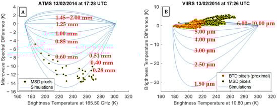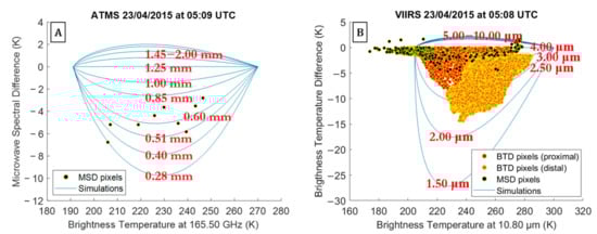 Regarding the retrieval, Figure 9A details the simulated curves for MW-MMW volcanic particles. The black points represent the volcanic particle pixels previously detected using the MSD method. These points are associated with particles of effective radius that vary from 0.28 to 0.60 mm. The points that lie outside the simulated curves are associated with their closest curve []. For the TIR curves, the detected ash particles have a particle radius that ranges between 5.00 and 10.00 μm. These points are represented in Figure 9B as orange points. The black points represent the MW-MMW-detected pixels, which were resampled on the TIR grid (this is the reason why there are more than those displayed in Figure 9A). As expected, many points lie outside the simulated curves and have a positive BTD. These are the points that represent the areas contaminated by particles not visible at the TIR wavelengths due to sensor detection limits.