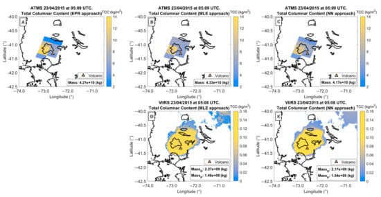 Associating each observation to its closest curve, the retrieval is, hence, performed. The MW-MMW masses obtained with the considered methods are EPR 4.21 ± 1.51 × 1010 kg; MLE 4.33 ± 1.56 1010 kg; and NN 4.17 ± 1.50 × 1010 kg, respectively. For all three methods, the higher mass is estimated on the west side of the volcano (yellow pixels), in proximity to the top of the umbrella at an altitude of ≈19 km [], see Figure 13A–C. The smaller mass is associated with the areas far from the volcanic crater (bright blue pixels). The estimated mass and the TCC maps, for both the MLE and the NN, are in good agreement with the one obtained using the parametric formula (EPR). The small changes between the estimates can be explained with the different polarisation corrections and the ignored multiple diffusion effects. For the TIR observations, the estimated masses are, respectively, MLE 1.48 ± 0.53 × 109 kg and NN 1.54 ± 0.55 × 109 kg. For consistency, we also report the estimates for the distal ash cloud, which are 2.37 ± 0.85 × 109 kg for MLE and 2.17 ± 0.78 × 109 kg for NN. The TIR proximal and distal masses are reported in Figure 13D,E with the acronyms and . For both MLE and NN TIR results, the highest mass loading is associated with the centre of the cloud (yellow pixels) with values in the range of 0.06–0.08 kg/m2, see Figure 13D,E. However, the NN TCC map (Figure 13E) is more in line with the EPR map (Figure 13A). Indeed, Figure 13A,C,E are in good agreement with each other (see yellow and blue pixels) in terms of mapping. Moreover, in this case, we conclude that the NN results are more in line with the EPR results and past studies [,]. If we sum the NN MW-MMW and TIR mass estimates, we obtain a mass of 4.32 ± 1.56 1010 kg that is in line with previous studies on the deposit (3.33–4.71 1010 kg) [].