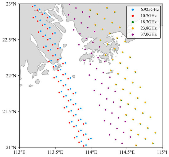 - A scan position check. Figure 4 shows the spatial distribution of the first five pixels of the SMR between different frequencies ranging from 6.925 GHz to 37 GHz. It can be seen that there are significant discrepancies in the distribution of pixels between the different frequencies (Figure 4), which is mainly due to the SMR using three feedhorns to receive radiation signals ranging from 6.925 GHz to 37 GHz. Due to this difference in the location of each frequency’s pixel, some of the SMR pixels would be lost after resampling to the resolution of 6.925 GHz, and the available pixels are not consistent between different frequencies (Table 3). In order to equalize the number of SMR pixels with different frequencies, the first 17 pixels and the last 5 pixels for all channels of the SMR are discarded.