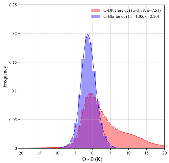 O-B probability density function (PDF) profiles of the 37 V SMR channel. The O-B statistics are based on GRAPES-GFS from 10 to 24 July 2021. The red/blue bars correspond to the PDF of the O-B before/after the QC procedures, respectively.