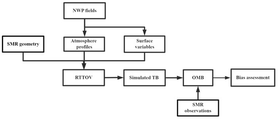 The basic flowchart for the simulation of the SMR observation based on the coupling of the RTTOV and NWP fields is illustrated in Figure 6. First, we use bilinear interpolation in order to match the horizontal grid of the NWP fields to the observation pixels. Then, the atmospheric information from NWP fields and geometry variables from the satellite are transformed into the simulated TBs by the RTTOV model. The bias characteristics of SMR can be assessed by comparing the differences between the simulated TBs and observed TBs.