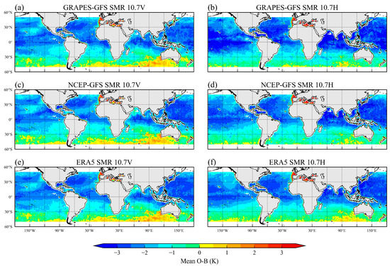 Spatial distribution of O-B over one month (from 10 July 2021 to 10 August 2021) for (a) GRAPES-GFS, SMR 10.7 V channel, (b) GRAPES-GFS, SMR 10.7 H channel, (c) NCEP-GFS, SMR 10.7 V channel, (d) NCEP-GFS, SMR 10.7 H channel, (e) ERA5, SMR 10.7 V channel, (f) ERA5, SMR 10.7 H channel. All statistics were calculated after applying the QC procedures described in Section 2.4.