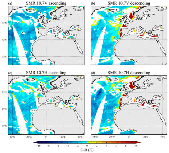 The spatial distribution of O-B for the SMR 10.7 GHz channels from 1200 UTC 10 July 2021 to 1200 UTC 11 July 2021, for (a) SMR 10.7 V channel, ascending data only, (b) SMR 10.7 V channel, descending data only, (c) SMR 10.7 H channel, ascending data only, and (d) SMR 10.7 H channel, descending data only. O-B statistics are based on NCEP-GFS, and the latitude check was not considered here.