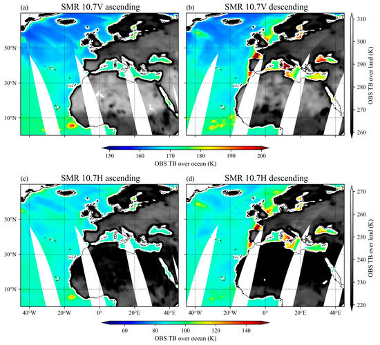 The spatial distribution of observed TBs for the SMR 10.7 GHz channels from 1200 UTC 10 July 2021 to 1200 UTC 11 July 2021 for (a) the 10.7 V channel, ascending data, (b) the 10.7 V channel, descending data, (c) the 10.7 H channel, ascending data, and (d) the 10.7 H channel, descending data. Two different colored bars are used for the observed TBs over ocean and over land, respectively.