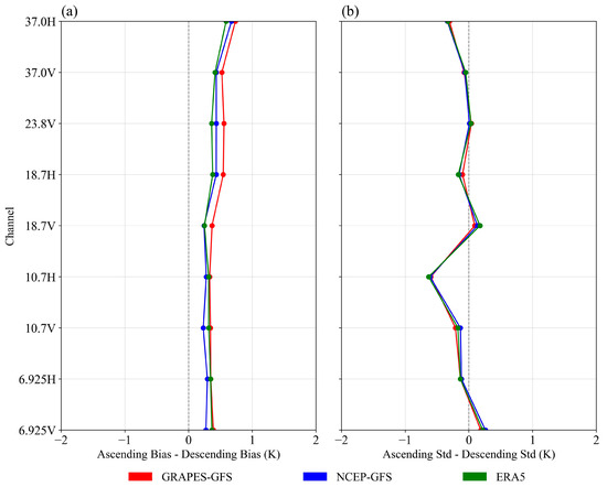 The HY-2B SMR ascending data statistics minus equivalent statistics for descending data: (a) the AD biases for all channels; (b) the AD standard deviations for all channels. Statistics are from 10 July 2021 to 10 August 2021 after applying the QC procedure described in Section 2.4. The green line represents the O-B statistics based on ERA5, the blue line represents the O-B statistics based on NCEP-GFS, and the red line represents the O-B statistics based on GRAPES-GFS.