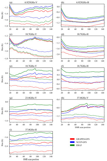 However, there are also some deficiencies in the SMR radiance data. First, in the SMR’s descending orbit, some significant positive biases were found around Europe for the 10.7 GHz channels. This bias pattern may be caused by the RFI from geostationary communication satellites. In addition, the discrepancies between the ascending and descending data have been investigated. All SMR channels show systematic positive AD biases, with a range of 0.3–0.7 K, and the spatial distribution of the O-B bias shows some differences between the ascending and descending data. The O-B bias of the ascending data is warmer than the descending data in the southern hemisphere and cooler than the descending data in the mid-latitude area of the northern hemisphere. Moreover, the AD bias in summer is obviously warmer than in winter. This spatial distribution characteristics and seasonal variation of the AD bias suggest that this might be related to the effects of solar heating on the satellite or the emissions of the main reflector. Finally, the character of the scan-position-dependent bias was also evaluated for each channel. It can be seen that the scan-position-dependent bias is considerably smoother for the descending data, with a variation of less than 0.2 K. On the contrary, the scan-position-dependent bias of the ascending data fluctuates significantly, with a maximum along-scan variation of more than 0.7 K for some channels. Furthermore, the scan-position-dependent bias of the ascending data shows similar variation characteristics between some channels.