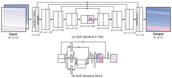 The self-attention U-Net is shown in Figure 2 which consists of an encoder, a decoder, and the corresponding shortcuts. The classic 2D U-Net [] is used in this paper. There are four convolutional layers with ReLU for encoders, where the kernel size is and channel size is , and means the layer depth of the encoder. The decoder has a symmetrical structure, so convolutional layers are replaced by the transposed convolutional ones.