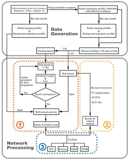 - Peak signal to noise ratio (PSNR): The original amplitude of the profile is normalized to the image grey level to calculate the peak signal-to-noise ratio, which could characterize the quality of the predicted profile from an image perspective. The unit is dB. n is the number of profiles.The complete workflow would follow Figure 3. Creating a sufficient dataset is the first step. Data augmentation aims to generate impedance profiles with different resolutions. According to seismic convolutional theory, seismic imaging profiles could be synthesized by forward simulation. The second step is training the self-attention U-Net by minimizing loss. We could predict impedance by blurred imaging profiles by using the well-trained network. After that, the results estimated by contrast methods are given in the third step. We can finally evaluate these results using four kinds of indexes.Figure 3. Complete workflow: Including two parts, data generation, and network processing. Network processing has three steps: training, validating, and evaluating.