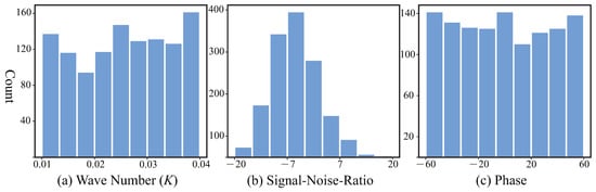 According to (1) and an impedance profile in Figure 4a, the reflection coefficient profile (Figure 4c) in the spatial vertical direction can be calculated from . The Ricker wavelet in the spatial domain with a random phase P ranged [−60, 60] and a random wave number K in the range of [10, 40]∗10 (m) is convolved with to obtain profile (Figure 4d), i.e., wavelet fuzzification. To simulate the field survey, random noise has been added to and the noisy profile (Figure 4e) is available for our further tests. Making the signal-to-noise ratio () of all conform to the positive-skewed distribution with a skewness coefficient is about 0.075. The distributions of these three factors are shown in Figure 5. Considering the energy attenuation since seismic wave propagation, the amplitude of attenuates with depth linearly. The amplitude of the deepest layer is 0.5 times the original amplitude. Finally, the seismic profile shown in Figure 4f is generated.