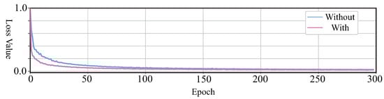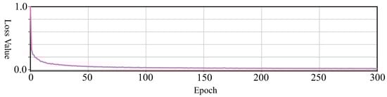 Training is terminated after 300 epochs (i.e., 1158 × 0.7 × 300 = 243,300 iterations), and the convergent curve of loss value is shown in Figure 6. To validate this method concretely, Figure 7 validates convergence by outputs at different epochs. From Figure 6 and Figure 7d, the loss is relatively low at 50 epochs, but the impedance profile is blurry at details of high frequency. With more training epochs, the network could predict the wide-band impedance profile shown in Figure 7e, which is close to the label shown in Figure 7f.