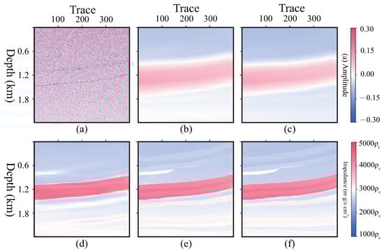 Dataset generation. (a) Impedance profile with constant density , (b) background impedance , (c) reflection coefficient profile , (d) seismic profile with convolution by K = 0.030, P = 0 Ricker wavelet, (e) seismic profile with = −5.00dB, (f) seismic profile with linear attenuation.