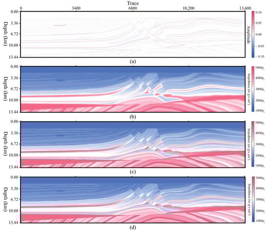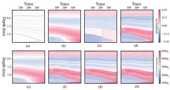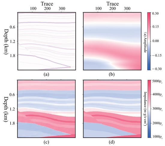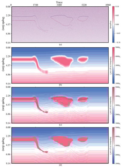 First, the impedance profiles with consistent density but different resolutions are obtained by the pyramid method. Second, a square window strides on these profiles to crop, and patches with local or global impedance features but the same shape are obtained. The Marmousi, Pluto, and Sigsbee 2A [,,] profiles with P-wave speed and consistent density shaped by (2801, 13,601), (1201, 6960), and (1201, 3201), respectively, are resampled to (400, 400). Finally, there are 1158 profiles with P-wave speed and consistent density in this paper. A profile is shown in Figure 4a.