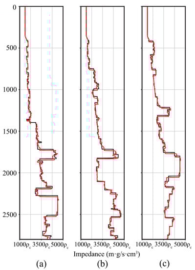 The predicted (red) and true (black) impedance of a single trace (a) No. 3500, (b) 8680, and (c) 12,200, from Marmousi.