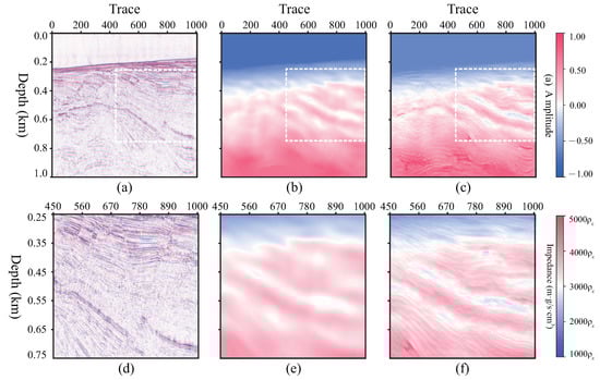 Result of inline No.750 slice. (a) The migrations. (b) The background impedance. (c) The prediction. (d–f) The zoomed-in area of (a–c).
