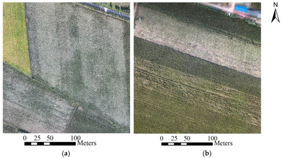 Many pictures are acquired after the drone flight is finished, and the advanced agriculture mapping software Pix4Dfields for aerial crop analysis and digital farming is used to perform image mosaic and geographical registration. Examples of the processed UAV images are shown in Figure 2: the light fields are lodged corn-planted areas, and the varied green fields are the non-lodged areas. The field in Figure 2a is oriented north–south, and the field in Figure 2a is oriented east–west. We can see that the textural characteristics and textural orientations of the lodged areas differ for the different fields in Figure 2a,b.