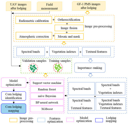 Schematic diagram of corn lodging identification using GF-1 PMS images.