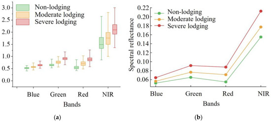 The boxplot (a) and spectral difference (b) of the non-lodged, moderately lodged, and severely lodged areas within four spectral bands.