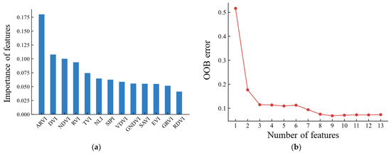The index is calculated to rank the 13 vegetation indexes in Table 5. The ranking results in Figure 5a shows that the feature with the highest importance is ARVI. In addition, the four features of DVI, NDVI, RVI, and TVI were ranked high in importance, and the remaining eight features (NLI, SIPI, VDVI, GNDVI, SAVI, EVI, GRVI, and RDVI) have relatively low scores. In order to determine the optimal combination of the vegetation indexes, the image features are combined one by one according to the ranking results of importance. The out-of-bag (OOB) error of the random forest classifier is used to determine the number of image features. Figure 5b is the line chart of the number of vegetation indexes with the OOB error. Firstly, the OOB error decreases quickly from 0.516 to 0.177 after the first important ARVI feature is joined. Secondly, the OOB error decreases slower from 0.177 to 0.115 after the second important DVI feature is joined. Next, the OOB error decreases from 0.115 to 0.113 with a decreased value of only 0.002. Subsequently, the OOB error decreases slowly with the joining of more vegetation indexes. The OOB error reaches a minimum of 0.069 when the number of vegetation indexes reaches nine. After that, the OOB error is stabilized despite more vegetation indexes being joined. Therefore, the optimized vegetation index combination is ARVI, DVI, NDVI, RVI, TVI, NLI, SIPI, VDVI, and GNDVI.