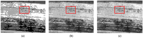 The gray level of a GF-1 PMS image determines the size of the GLCM, and a GLCM with the size of 256 × 256 will be produced from one band only with 256 gray levels. Therefore, there will be a huge computational and time-consuming effort using the original 256 gray levels to calculate the GLCM. So, the optimization of compressing grayscale is performed first. Figure 6a–c depicts the corn lodged area with the gray level of 8, 16, and 32 in the GF-1 PMS image, respectively. The boxed area in Figure 6 is the moderately lodged area, which has been confused with a severely lodged area (bright white area) in an image with eight gray levels. This confusion problem is relieved when the gray level increases to 16 gray levels, after which these three kinds of lodged areas can be distinguished clearly.