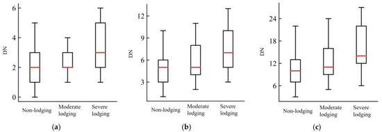 With increasing the image gray level to 32 levels, the distinction between the non-lodged, moderately, and severely lodged areas is almost similar. Figure 7 shows the statistical variation of gray values in the non-lodged area, moderately lodged area, and severely lodged area with the gray levels of 8 (a), 16 (b), and 32 (c). We can see that there is obvious spectral confusion with a gray level of 8 (Figure 7a), and this problem is relieved with a gray level of 16 (b) and 32 (c). There is almost no difference in boxplots shown in (b) and (c). Based on the results of Figure 6 and Figure 7, we use the gray level of 16 for the GLCM textural features calculation.