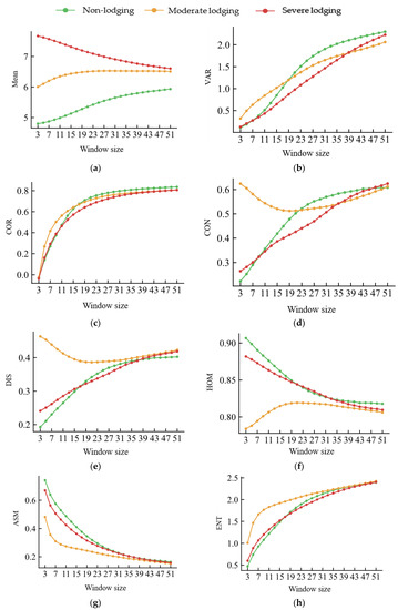 Window size is essential for texture features, and windows with different sizes can capture textural information on different scales. A small window cannot cover the complete textural features of the cropland, and a too-large window will create a spectral and textural mixture. So, the window size should be determined. The window size is expressed as (2N + 1) × (2N + 1), where N = 1~25 in this study. Therefore, there are 26 window sizes used for calculating the textural features. Figure 10 shows the calculated Mean (a), VAR (b), COR (c), CON (d), DIS (e), HOM (e), ASM (f), and ENT (g) using window sizes from 3 × 3 to 51 × 51, respectively. Figure 10 shows a noticeable textural difference with the window size of 3 × 3 for the non-lodged area, moderately lodged area, and severely lodged area in addition to the textural features of VAR (b) and COR (c).