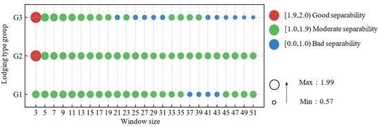 J.M. distance of the non-lodged, moderately lodged, and severely lodged areas for the textural features using window sizes from 3 × 3 to 51 × 51.