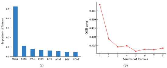 The importance ranking (a) and OOB error (b) of eight textural features.