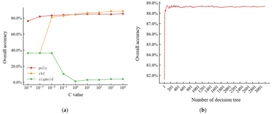 Two essential SVM parameters should be optimized: the penalty parameter C and kernel function [38]. Figure 13a shows the overall accuracy using different kernel functions and C values. For the kernel function, the overall accuracy value using the sigmoid kernel function is lower than that of the poly and rbf. For the C value, there is almost no change in overall accuracy using the poly kernel function when the C value changes, which means the C value is insensitive to the poly kernel function. Therefore, the rbf kernel function is used for the corn lodging identification. Based on Figure 13a, we determined that the rbf kernel function and a C value of 104 are the optimized parameters of SVM. In addition, we optimize the gamma parameter of the rbf kernel function, and the gamma parameters to be selected are 0.1, 1, 3, 5, 7, and 9 respectively. The best gamma parameter compared by cross-validation is 7.