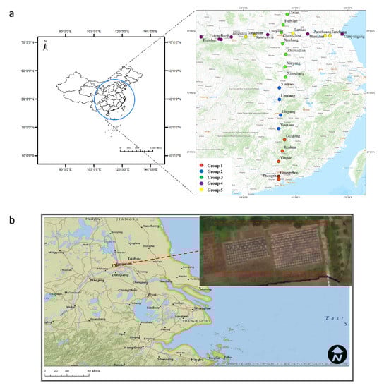 (a) Study area and sampling locations of Bermuda grass cpDNA sequences from 28 populations along longitudinal and latitudinal gradients. Points represent the locations where samples were collected, and colors illustrate five distinct genotypic groups (1–5). (b) Location of the study area—an experimental field in the campus of Yangzhou University.