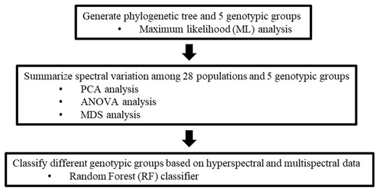 The random forest (RF) classifier was used to predict different genotypic groups based on hyperspectral and multispectral data. All samples were randomly partitioned into calibration (70%) and validation sets (30%). A total of 10 random forest models were built in each analysis, and each was constructed after resampling data to the same number of observations for different genotypic group due to unbalanced samples among the groups. Classification accuracy was assessed by summarizing three types of statistics across 10 random forest model replicates: F1 score (the harmonic mean of precision and recall) [56], Cohen’s kappa (the improvement in the model relative to the null expectation of random guessing) [57], and classification error rate (the predictive accuracy in out-of-bag predictions). All analyses (statistical, image, and GIS) were conducted in R (R 3.5.1, R Foundation for Statistical Computing, Vienna, Austria). Random forest models and classification statistics were, respectively, implemented in the random forest (4.6–14) package and caret (6.0–80) package in R using default parameters. The overall workflow of the data analysis is shown in Figure 2.