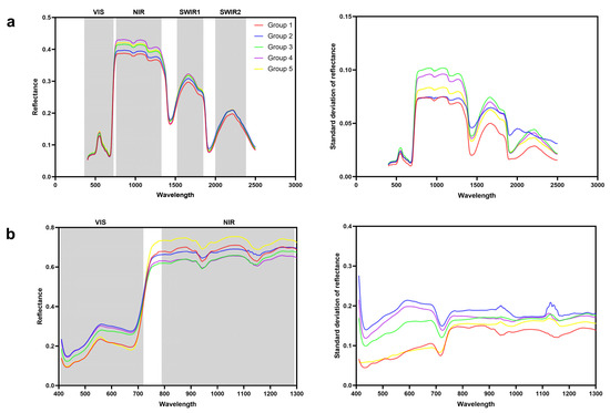 Reflectance variations among the five genotypic groups for (a) leaf hyperspectral measurement, and (b) canopy hyperspectral measurement. The left panels show mean % reflectance of each group indicate 95% quantiles, and the right panels show the standard deviation of leaf and canopy reflectance.